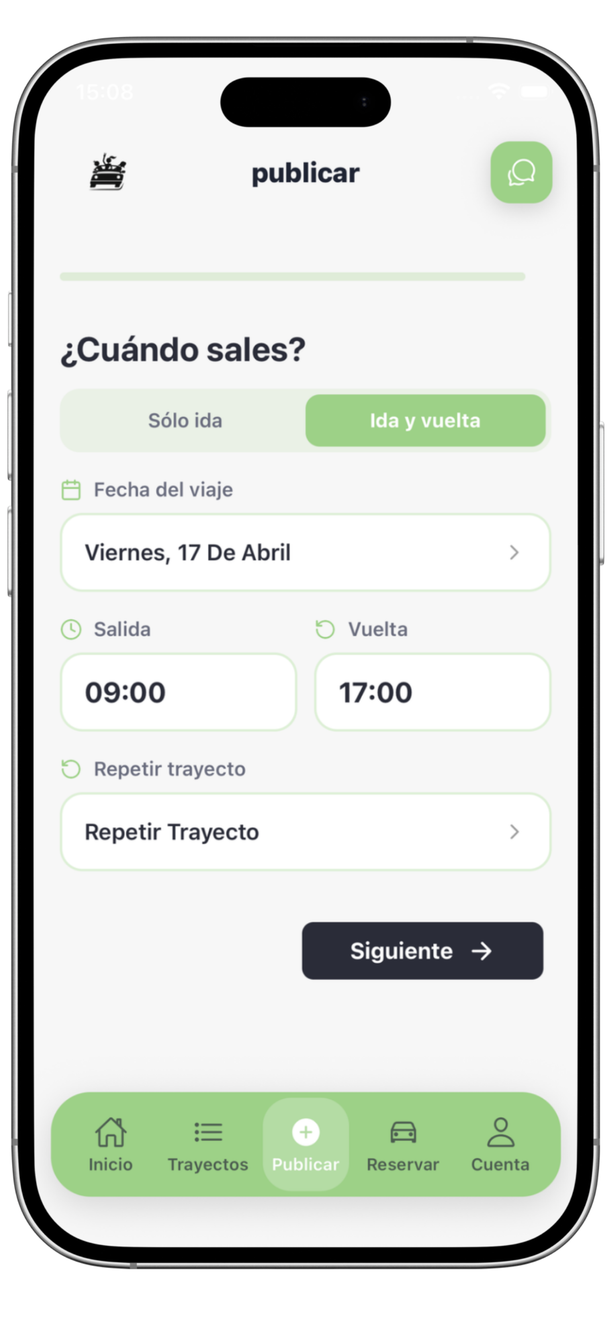 Abre la app y publica fácilmente tu ruta diaria. Indica tu origen, destino, horario y las plazas disponibles.
