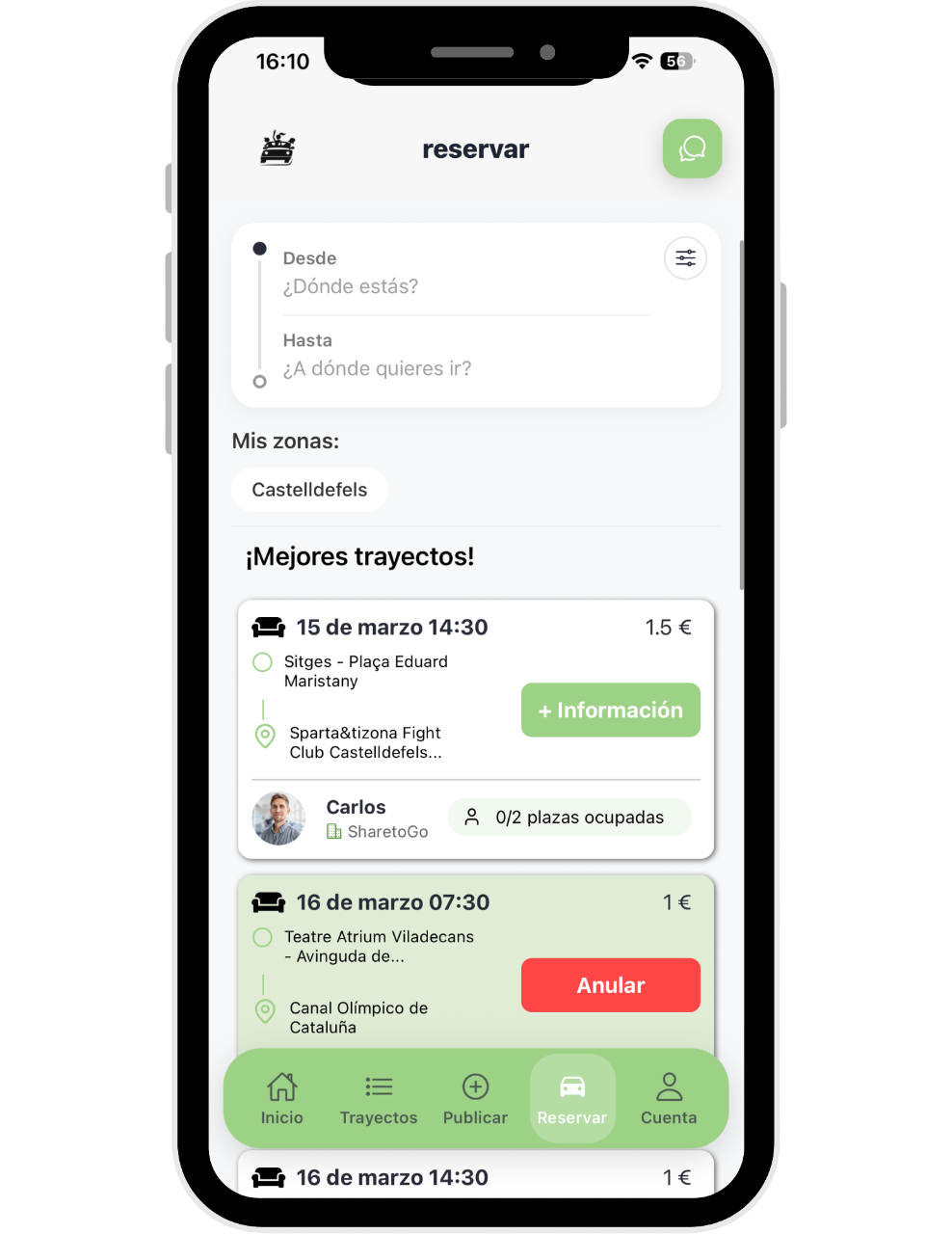 Tanto si ofreces tu coche como si buscas un trayecto, el proceso es sencillo e intuitivo.